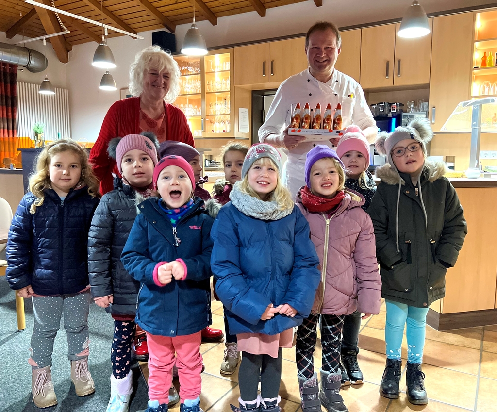 Mit leckerer Schokolade und tollem Gesang bedanken sich die Kinder des Familienzentrums Sögel, unter der Leitung von Irmgard Welling, bei unserem Gastronomieteam für den leckeren Mittagstisch, den A+W seit mittlerweile 17 Jahren für die Kinder zubereitet.